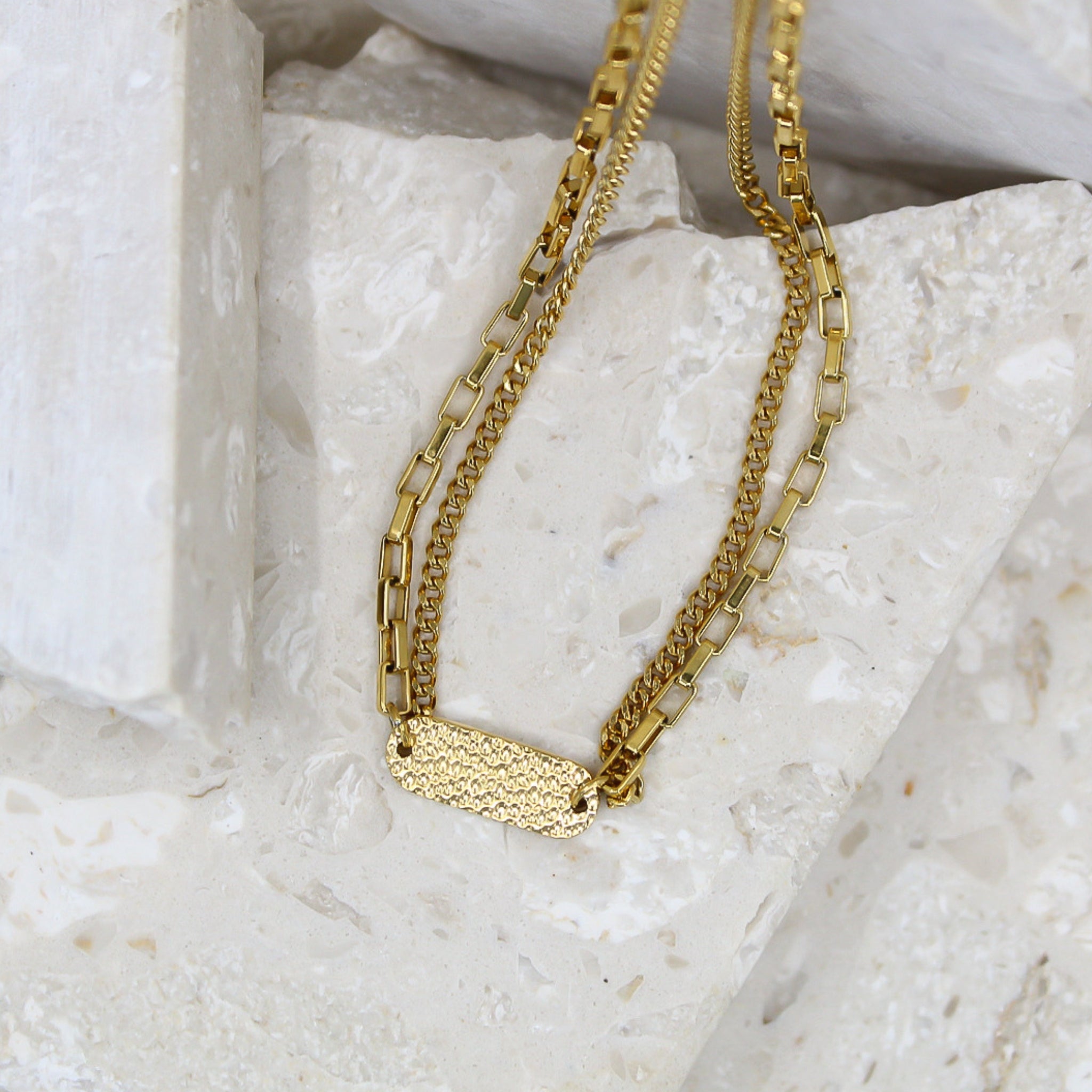 Ett halsband som kombinerar modern design med tidlös skönhet och består av en sofistikerad dubbelkedja som omfamnar din hals med en mjuk och följsam känsla.